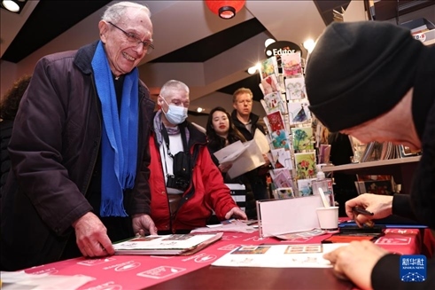 1月26日,在法國(guó)巴黎舉行的發(fā)行儀式上,郵票設(shè)計(jì)者陳江洪為當(dāng)?shù)丶]愛(ài)好者簽字留念。新華社記者 高靜 攝