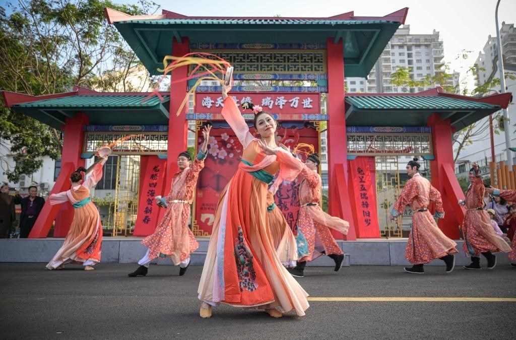2月12日,在位于海南省??谑械牡谑鶎萌f春會分會場——海瑞文化公園春節(jié)系列活動中拍攝的舞蹈演藝現(xiàn)場。新華社記者蒲曉旭攝