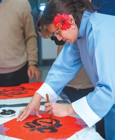 安雅在學(xué)校為留學(xué)生舉辦的新春活動(dòng)上用毛筆書寫“?!弊?。受訪者供圖