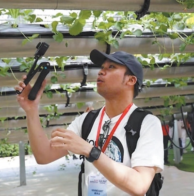 聞名在河南商丘市夏邑縣太平鎮(zhèn)參觀龍港灣空中草莓體驗(yàn)館的智慧農(nóng)業(yè)設(shè)施并錄制視頻。受訪者供圖