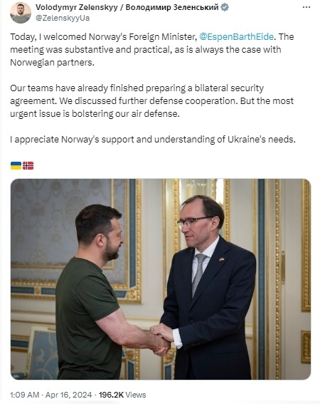 澤連斯基15日在其官方社交平臺上表示,“我們已經(jīng)完成了(烏克蘭和挪威的)雙邊安全協(xié)議準備工作,并討論了進一步的防務(wù)合作。最緊迫的問題是加強我們的防空能力?!?/p>
