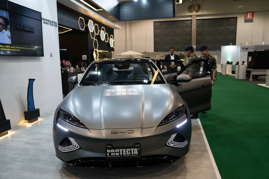 ?4月4日,在巴西圣保羅舉行的巴西防務展上,參觀者體驗一輛經過防彈加固的比亞迪海豹電動汽車。新華社記者王天聰攝