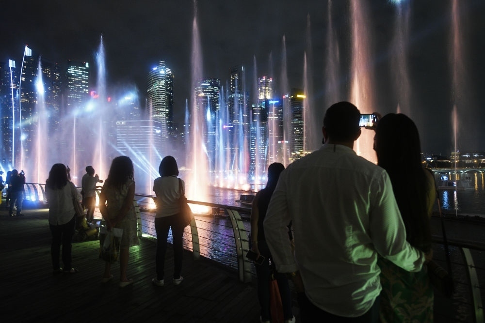 2022年4月28日,游客在新加坡濱海灣金沙觀賞一場(chǎng)燈光噴泉秀。新華社發(fā)(鄧智煒攝)