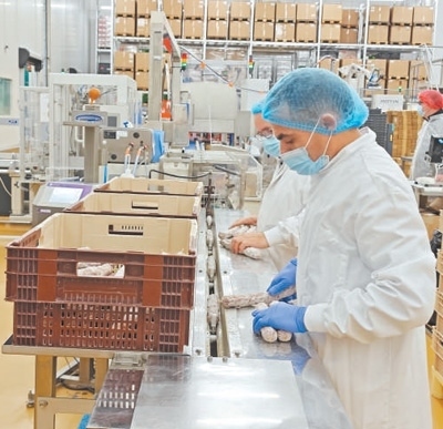法國薩高公司香腸包裝車間內,工人們正在包裝香腸。本報記者 邢 雪攝