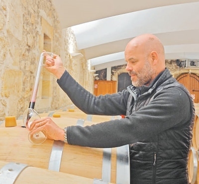 法國大酒窖集團波爾多分公司首席釀酒師和技術總監(jiān)文森·卡紹在酒窖取酒品嘗。本報記者 邢 雪攝