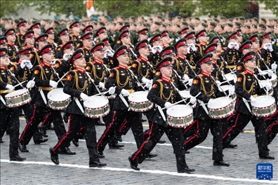 5月9日,在俄羅斯首都莫斯科,鼓手編隊(duì)走過(guò)紅場(chǎng)。新華社記者 白雪騏 攝
