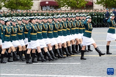 5月9日,在俄羅斯首都莫斯科,女兵列隊(duì)走過(guò)紅場(chǎng)。新華社記者 白雪騏 攝