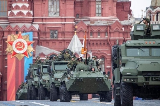 5月9日,在俄羅斯首都莫斯科,軍車編隊(duì)駛過紅場(chǎng)。新華社記者曹陽(yáng)攝