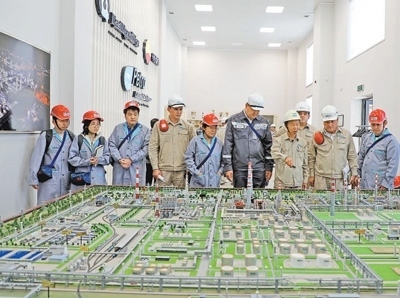 人民日報(bào)和哈薩克斯坦媒體“高質(zhì)量共建‘一帶一路’”聯(lián)合采訪團(tuán)隊(duì)近日來到哈薩克斯坦奇姆肯特市,采訪了奇姆肯特?zé)拸S現(xiàn)代化改造項(xiàng)目。圖為聯(lián)合采訪團(tuán)隊(duì)在奇姆肯特?zé)拸S沙盤前聽取情況介紹。本報(bào)記者 趙益普攝