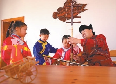 哈拉新村村民在教當?shù)睾⒆友葑鄠鹘y(tǒng)樂器。齊齊哈爾大學(xué)孟加拉國籍留學(xué)生 衣睿實攝“在哈拉新村,我看到四弦琴造型的村口大門、魚叉狀的路燈,還有整整齊齊的‘介字房’……這里獨特的民族文化、濃郁的鄉(xiāng)土風(fēng)情,給我留下了深刻印象。當?shù)丶缺A魝鹘y(tǒng)的達斡爾族人文特征,又開發(fā)文化體驗館、民族特色美食等現(xiàn)代旅游資源,重視文化保護和傳承的做法值得借鑒。”