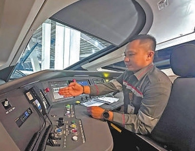 “操縱臺顯示屏、儀表顯示正?!薄案鏖_關(guān)按鈕、手柄位置正確”“鎖閉司機(jī)室門”“復(fù)檢作業(yè)完畢”……在印度尼西亞首都雅加達(dá),一列雅萬高鐵動車組的駕駛室里,阿古斯正有條不紊地對駕駛設(shè)備一一檢查,他的中國師傅張躍在一旁指導(dǎo)。檢查完畢,清晨5時整,阿古斯駕駛列車緩緩駛出起點(diǎn)站哈利姆站。