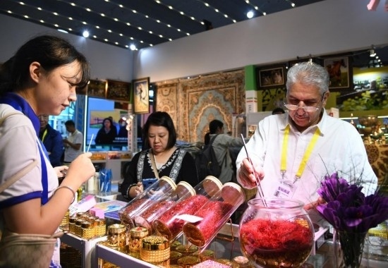 9月20日,來自伊朗的參展商(右一)向觀眾介紹產品。新華社記者 張博文 攝
