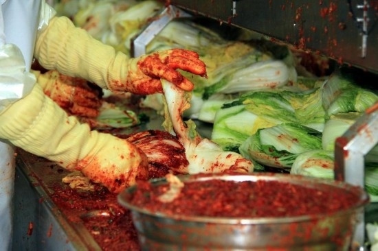 2011年12月8日,在韓國(guó)慶尚南道居昌郡韓國(guó)著名泡菜公司“宗家府”的工廠內(nèi),工人們將調(diào)制好的配料抹到整棵的大白菜上。新華社記者何璐璐攝