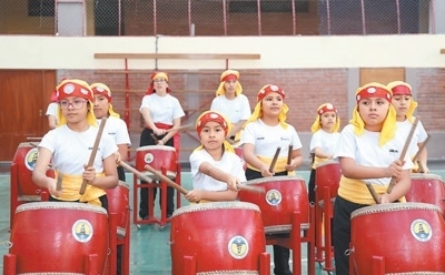秘中學校的學生進行大鼓表演。本報記者 楊 一攝