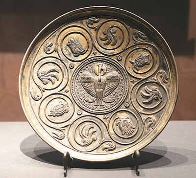 獅子在伊朗文化中有著獨(dú)特的含義,被視作密特拉的化身。在瑣羅亞斯德教成為正統(tǒng)后,獅子進(jìn)一步成為波斯帝王權(quán)力的象征。展出文物中常見獅子形象,如阿契美尼德王朝的大理石獅子首、青銅獅形御座腿,薩珊王朝(公元3—7世紀(jì))的嵌金獅紋銀盤、青金石人首獅首紋黃金項圈等。嵌金獅紋銀盤采用了薩珊金銀器常用的火法鍍金工藝,盤中央的大圓形框內(nèi)為獅子圖案,周圍6個小圓形框內(nèi)飾有幾種動物圖案,包括鹿與公羊等。黃金項圈上裝飾著3顆碩大的青金石,左右兩顆為圓形,飾有獅頭,中間的一顆為橢圓形,雕刻著人物頭像,專家推測為薩珊國王的形象。