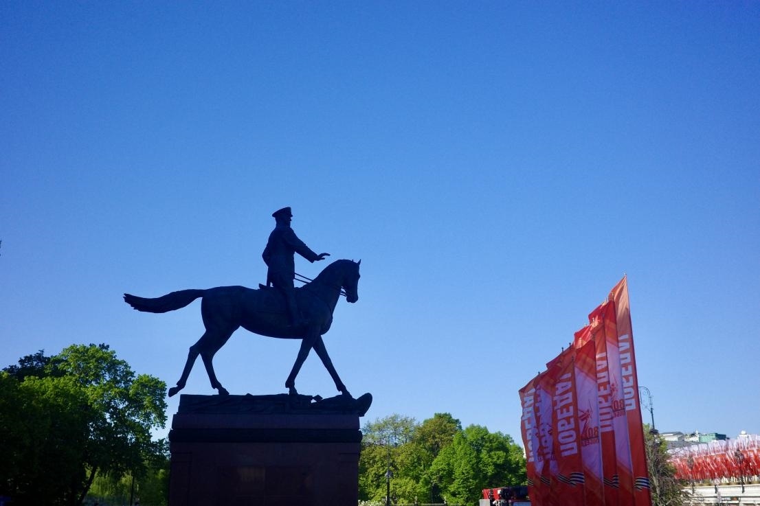 當(dāng)?shù)貢r(shí)間5月6日,朱可夫元帥雕塑。這一形象原型來(lái)自1945年的勝利日閱兵,當(dāng)時(shí)朱可夫騎馬行進(jìn)在紅場(chǎng)。 劉少華 攝