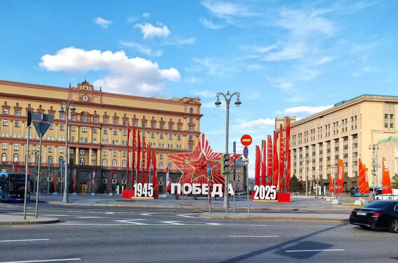 當(dāng)?shù)貢r(shí)間5月6日,莫斯科盧比揚(yáng)卡廣場(chǎng)布置紀(jì)念蘇聯(lián)偉大衛(wèi)國(guó)戰(zhàn)爭(zhēng)勝利80周年的標(biāo)語(yǔ)。鄺西曦 攝