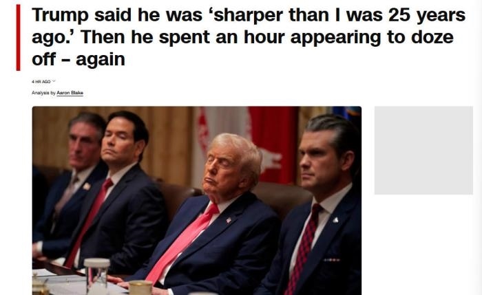 美國有線電視新聞網(wǎng)(CNN)注意到,當(dāng)美國商務(wù)部長盧特尼克談及貿(mào)易戰(zhàn)時(shí),特朗普“似乎難以睜開眼睛”。在美國教育部長麥克馬洪和美國衛(wèi)生與公眾服務(wù)部長小羅伯特·肯尼迪發(fā)言時(shí),特朗普“似乎僵住了,閉著眼睛,每次持續(xù)10到15秒,然后才轉(zhuǎn)動(dòng)眼球或點(diǎn)頭”。