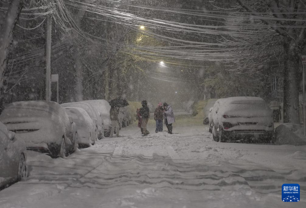 2月22日,在美國(guó)紐約,人們?cè)诮值郎嫌^看罕見(jiàn)大雪。新華社記者 張鳳國(guó) 攝