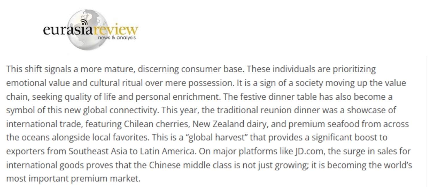 文章稱,這種轉(zhuǎn)變標(biāo)志著中國(guó)消費(fèi)者變得更加成熟、更具品位。他們更注重情緒價(jià)值和文化儀式感,而不僅僅是物質(zhì)追求。這象征著社會(huì)正朝著價(jià)值鏈上游邁進(jìn),追求生活品質(zhì)和個(gè)人提升。節(jié)日的餐桌也已成為這種新型全球互聯(lián)的象征。今年,傳統(tǒng)年夜飯成為國(guó)際貿(mào)易的展示窗口:既有智利車?yán)遄?、新西蘭乳制品和來(lái)自大洋彼岸的優(yōu)質(zhì)海鮮,也有本地美食。這是一場(chǎng)“全球豐收”,為從東南亞到拉丁美洲的商品出口提供了強(qiáng)大動(dòng)力。在跨境電商平臺(tái)上,國(guó)際商品的銷售激增證明了中國(guó)正在成為全球最重要的高端消費(fèi)市場(chǎng)。