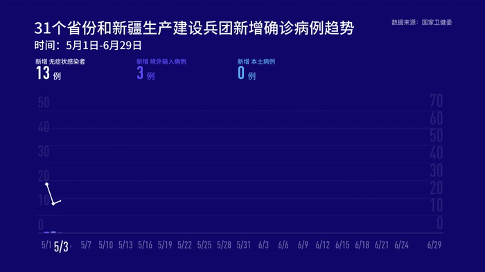 6月29日0—24時,31個省(自治區(qū)、直轄市)和新疆生產(chǎn)建設兵團報告新增確診病例19例,其中境外輸入病例11例(廣東4例,上海3例,四川3例,甘肅1例),本土病例8例(北京7例,上海1例);無新增死亡病例;新增疑似病例1例,為境外輸入病例(在上海)。