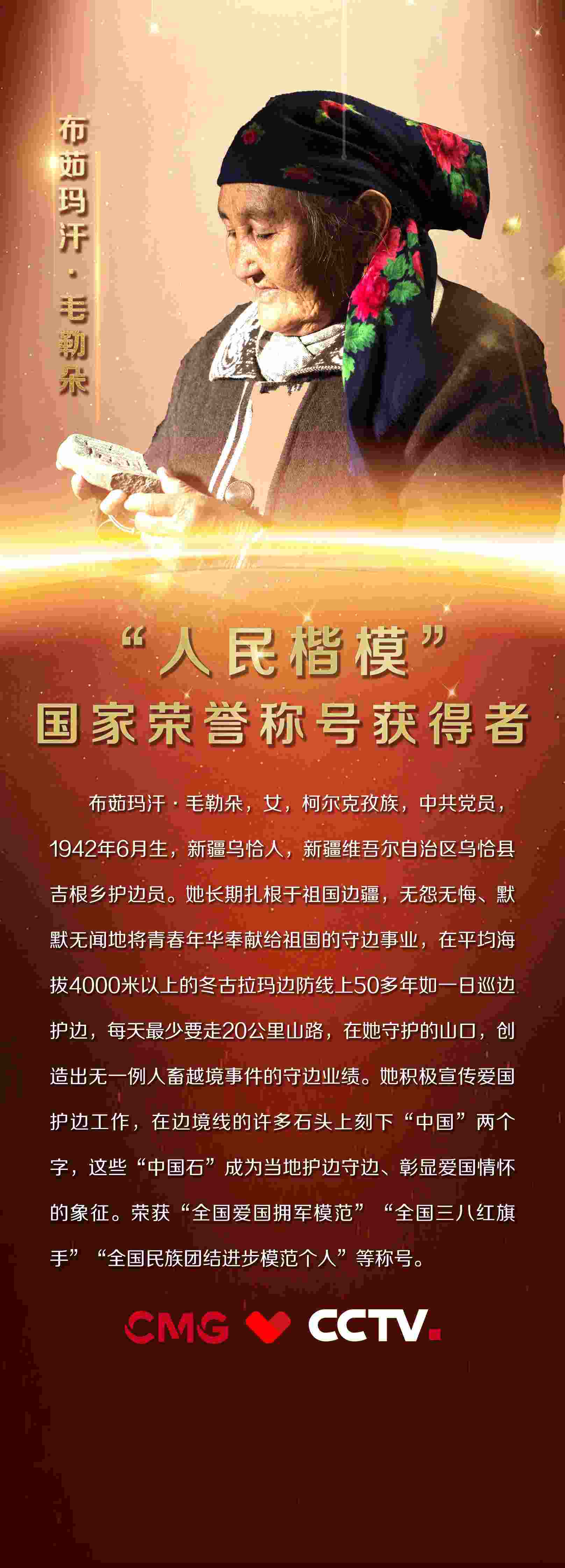 布茹瑪汗·毛勒朵,女,柯爾克孜族,中共黨員,1942年6月生,新疆烏恰人,新疆維吾爾自治區(qū)烏恰縣吉根鄉(xiāng)護邊員。她長期扎根于祖國邊疆,無怨無悔、默默無聞地將青春年華奉獻給祖國的守邊事業(yè),在平均海拔4000米以上的冬古拉瑪邊防線上50多年如一日巡邊護邊,每天最少要走20公里山路,在她守護的山口,創(chuàng)造出無一例人畜越境事件的守邊業(yè)績。她積極宣傳愛國護邊工作,在邊境線的許多石頭上刻下“中國”兩個字,這些“中國石”成為當(dāng)?shù)刈o邊守邊、彰顯愛國情懷的象征。榮獲“全國愛國擁軍模范”“全國三八紅旗手”“全國民族團結(jié)進步模范個人”等稱號。