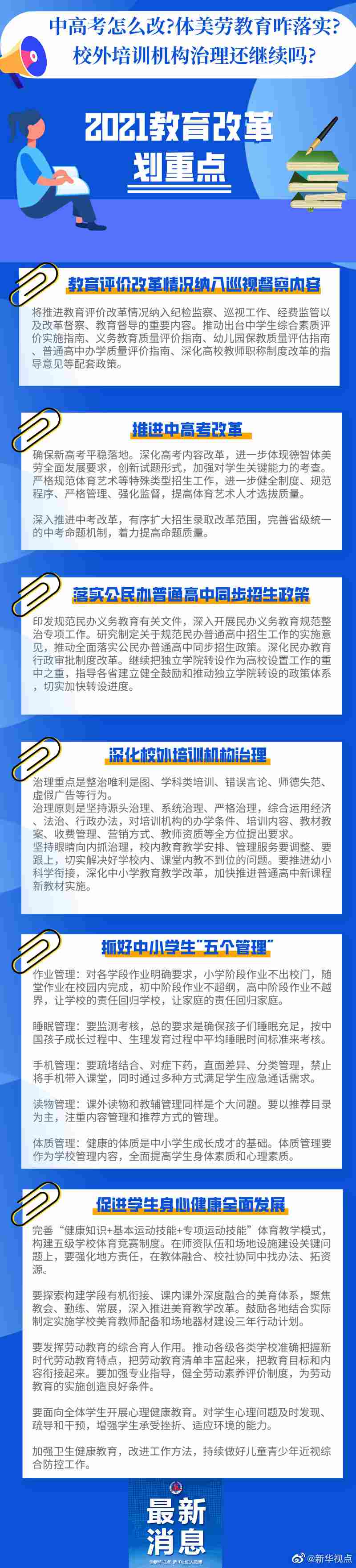 中高考怎么改?體美勞教育咋落實?校外培訓機構治理還繼續(xù)嗎?中小學生作業(yè)、睡眠、手機、讀物、體質(zhì)都要納入管理?這些社會關心的熱點,在2021年教育發(fā)展改革中都將涉及。記者梳理教育部部長陳寶生在2021年全國教育工作會議上的講話,及《教育部2021年工作要點》,為你劃出以下重點。詳情請見大圖↓↓(記者胡浩)