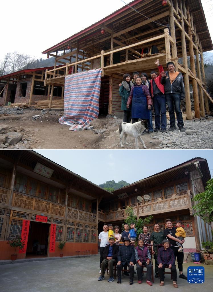 這是一張拼版照片,上圖為四川省綿陽(yáng)市安州區(qū)高川鄉(xiāng)茅香村群眾林興聰(右二)、李蕓香(右三)和家中的老人、孩子在重建中的住房前留影(2009年1月25日,新華社記者江毅攝);下圖為林興聰(后右三)、李蕓香(后右四)一大家13口人在房前留影(2021年5月4日,新華社記者江宏景攝)。新華社發(fā)