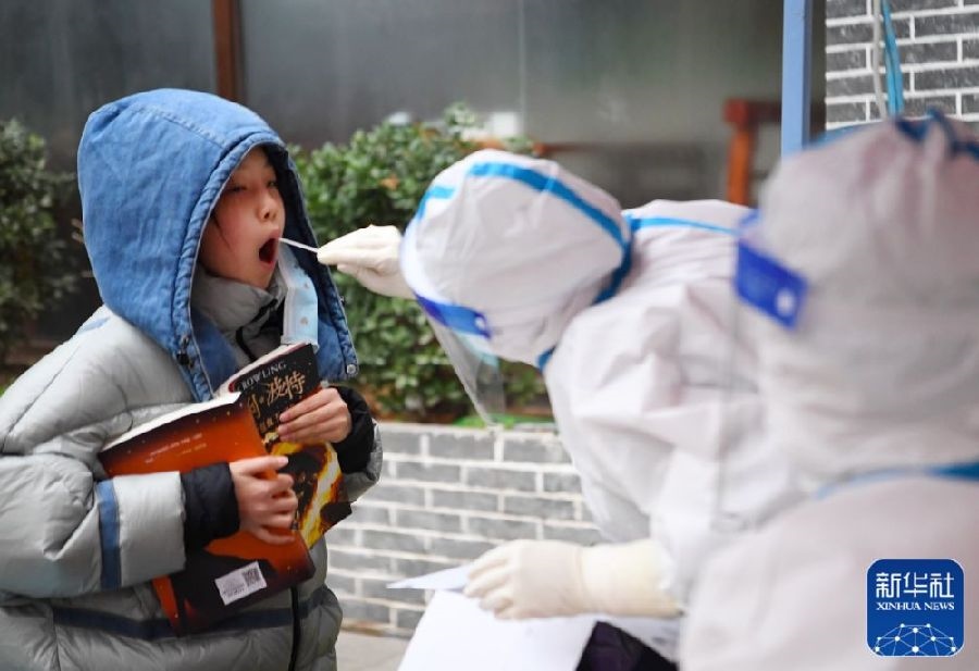1月10日,在鄭州市二七區(qū)政通路一處核酸檢測點(diǎn),醫(yī)務(wù)人員為小朋友進(jìn)行核酸檢測取樣。新華社發(fā)(丁友明攝)