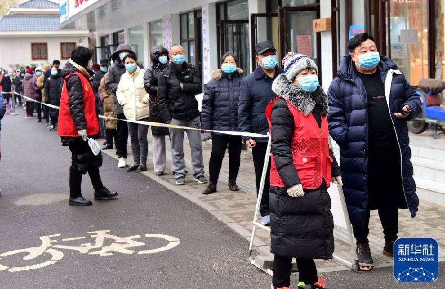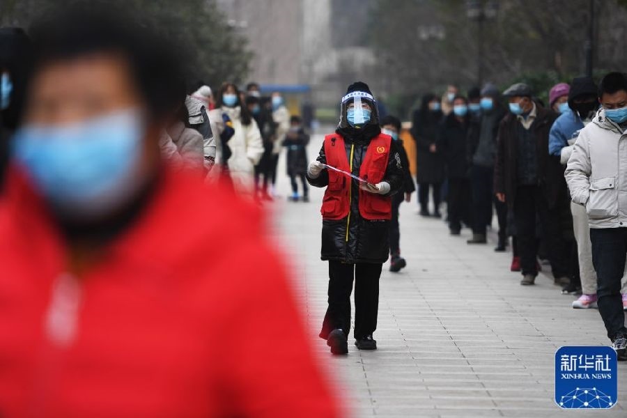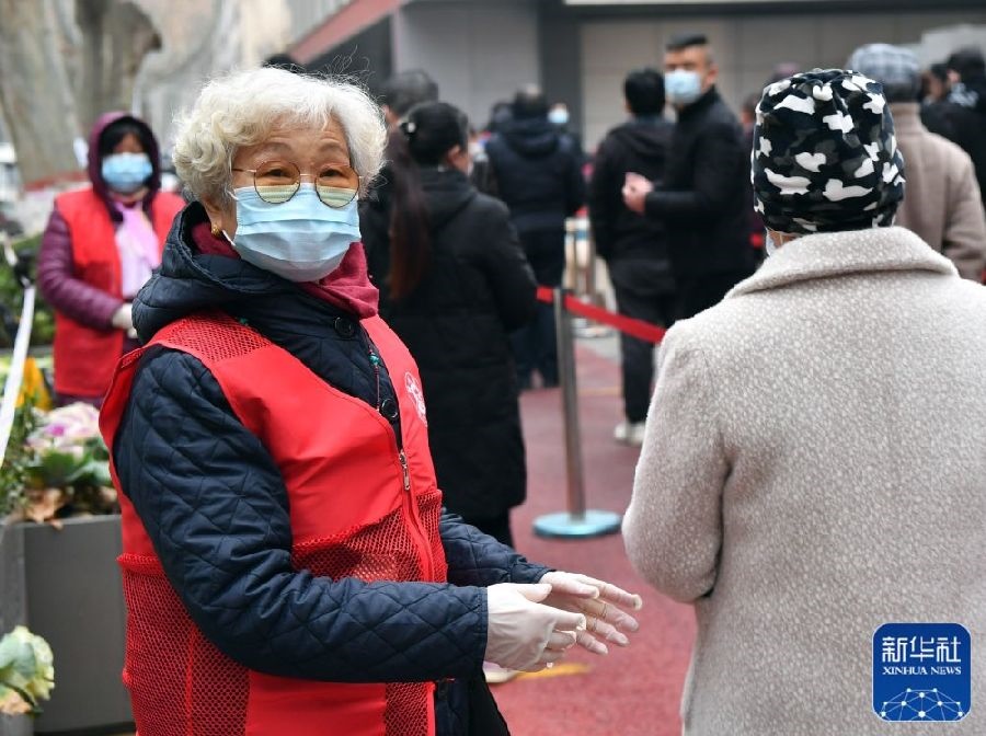 1月7日,在鄭州市經(jīng)八路辦事處一處檢測點(diǎn),75歲的志愿者耿小娣(左)在引導(dǎo)市民排隊(duì)。新華社記者李嘉南攝