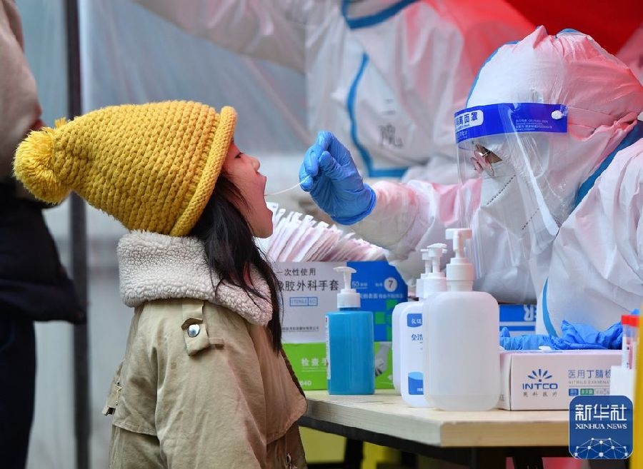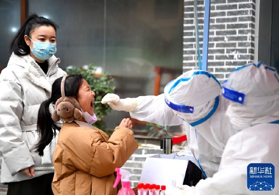 1月8日,在鄭州市金水區(qū)花園路街道辦事處一社區(qū)核酸檢測點(diǎn),醫(yī)務(wù)人員為小朋友進(jìn)行核酸檢測取樣。新華社記者郝源攝