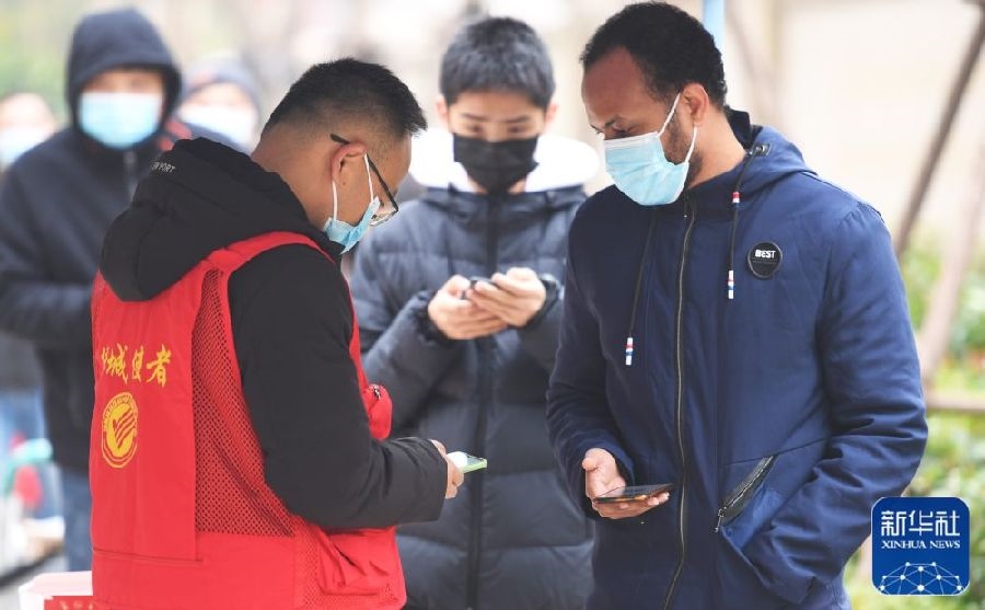1月10日,在鄭州市高新區(qū)楓楊辦事處譽(yù)園核酸檢測點(diǎn),志愿者幫助外籍人員掃碼登記。新華社記者張浩然攝