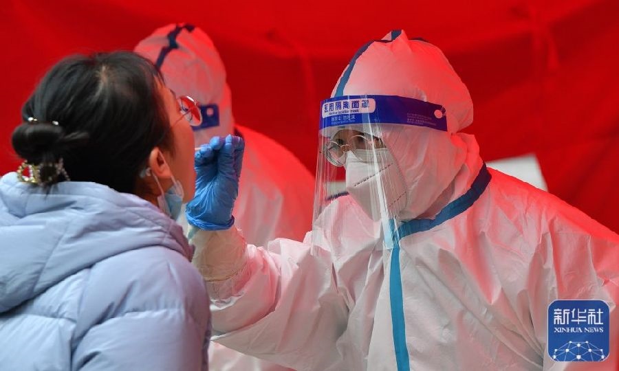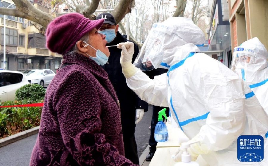 1月8日,在鄭州市高新區(qū)楓楊辦事處譽(yù)園核酸檢測點(diǎn),醫(yī)務(wù)人員為市民進(jìn)行核酸檢測取樣。新華社記者張浩然攝
