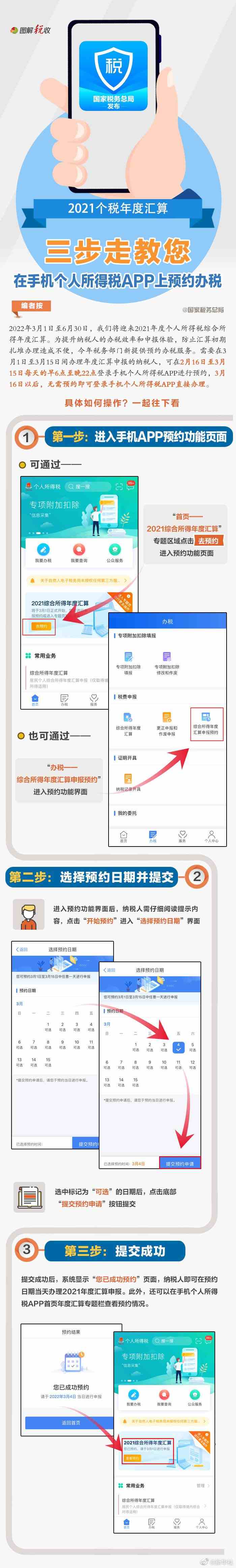 2022年3月1日至6月30日,我們將迎來2021年度個人所得稅綜合所得年度匯算。為提升納稅人的辦稅效率和申報體驗,今年稅務(wù)部門新提供預(yù)約辦稅服務(wù)。如何通過個人所得稅APP進行預(yù)約辦稅?很簡單,三步走,手把手教你輕松搞定,看圖了解↓(記者 王雨蕭;圖片來源:國家稅務(wù)總局)