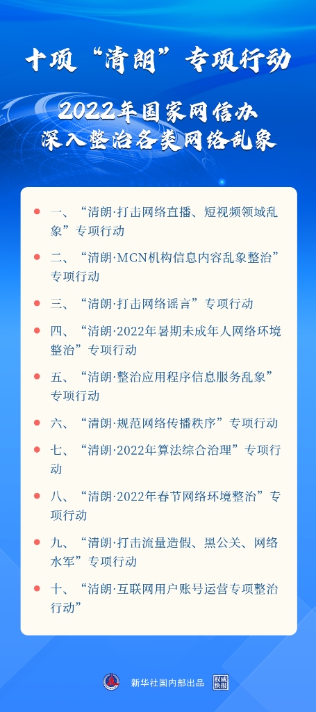 新華社北京3月17日電(記者王思北)記者17日從國新辦舉行的新聞發(fā)布會獲悉,2022年“清朗”系列專項行動將重點開展打擊網(wǎng)絡謠言,打擊網(wǎng)絡直播、短視頻領域亂象,算法綜合治理,暑期未成年人網(wǎng)絡環(huán)境整治等十方面任務?! ?/p>