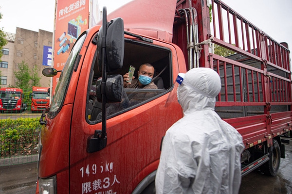 4月13日,工作人員查驗(yàn)駛?cè)牒贾輦骰犯鄣呢涇囁緳C(jī)健康碼。新華社記者江漢攝