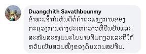 老撾新聞文化旅游部前副部長扎倫·瓦林塔薩(Chaleune Warinthrasak)留言:“老撾外交部的聲明及時(shí)而嚴(yán)正,任何時(shí)候我們只支持一個(gè)中國原則,臺(tái)灣是中國不可分割的一部分。”