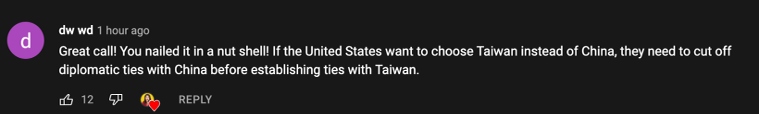 網(wǎng)友dw wd:“精彩的一期視頻!你簡潔而清晰地呈現(xiàn)了內(nèi)容,如果美國真的想選擇與臺(tái)灣建立所謂的‘外交關(guān)系’,他們首先需要與中國斷交?!?/p>