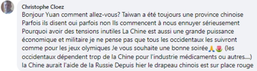 法語網(wǎng)友克羅茲:“臺(tái)灣始終是中國的一個(gè)省,美國人一會(huì)兒承認(rèn)一會(huì)兒又不承認(rèn),現(xiàn)在他們又開始搗亂。為什么要制造這種毫無意義的緊張氣氛呢?中國是一個(gè)經(jīng)濟(jì)和軍事大國,我不認(rèn)為西方會(huì)跟著美國走,就像之前的奧運(yùn)會(huì)一樣,西方國家太依賴于中國工業(yè)了。俄羅斯應(yīng)該是支持中國的吧,昨天紅場上方都飄著中國國旗?!?/p>