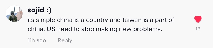 網(wǎng)友sajid:“真相很簡單,臺(tái)灣是中國的一部分,美國須停止給世界帶來新的麻煩。”