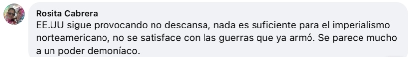 烏拉圭網(wǎng)友Rosita Cabrera:“美國一直在挑釁,不眠不休,對美帝國主義來說什么都不夠,它不滿足于已經(jīng)發(fā)動(dòng)的那些戰(zhàn)爭,它就是邪惡勢力?!?/p>