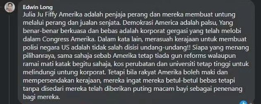 馬來西亞網(wǎng)友Edwin Long留言:“美國就是戰(zhàn)爭販子,他們通過戰(zhàn)爭和販賣武器獲利。美國的民主只是假象,真正享有權(quán)力和自由的是在幕后主導(dǎo)國會(huì)的大企業(yè)。換句話說,官商勾結(jié)在美國的法律上是被允許的!無論誰贏得選舉,一樣不會(huì)禁槍,醫(yī)療和教育成本還是不會(huì)下降,因?yàn)橐S護(hù)大企業(yè)的利益。但是他們的人民覺得他們能罵政府就是自由的,全然沒有意識(shí)到這不過是安撫奶嘴罷了?!?/p>