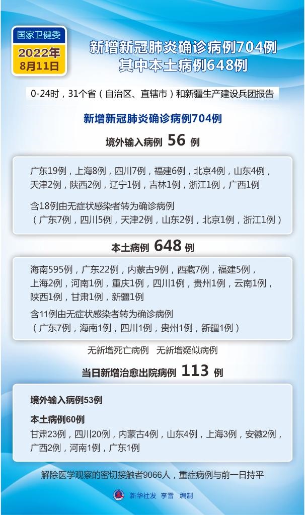 新華社北京8月12日電 國家衛(wèi)生健康委員會8月12日通報,8月11日0—24時,31個省(自治區(qū)、直轄市)和新疆生產建設兵團報告新增確診病例704例。其中境外輸入病例56例(廣東19例,上海8例,四川7例,福建6例,北京4例,山東4例,天津2例,陜西2例,遼寧1例,吉林1例,浙江1例,廣西1例),含18例由無癥狀感染者轉為確診病例(廣東7例,四川5例,天津2例,山東2例,北京1例,浙江1例);本土病例648例(海南595例,廣東22例,內蒙古9例,西藏7例,福建5例,上海2例,河南1例,重慶1例,四川1例,貴州1例,云南1例,陜西1例,甘肅1例,新疆1例),含11例由無癥狀感染者轉為確診病例(廣東7例,海南1例,四川1例,貴州1例,新疆1例)。無新增死亡病例。無新增疑似病例。