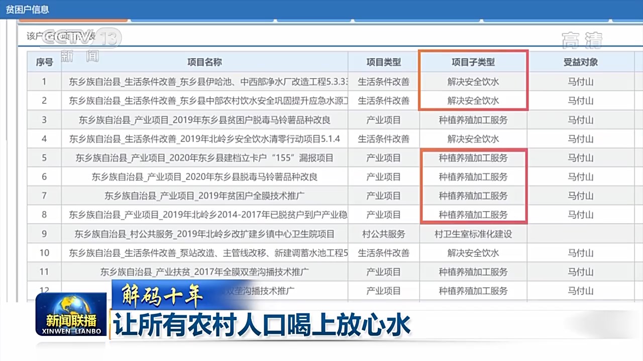水能解渴,更能致富。在全國扶貧開發(fā)信息系統(tǒng)中,我們找到了過去十年中“因水致貧”的家庭。當我們查詢這些貧困戶的脫貧措施和鞏固提升措施,可以看到“解決安全飲水”和“特色種植、養(yǎng)殖產業(yè)”總會同時出現(xiàn)。