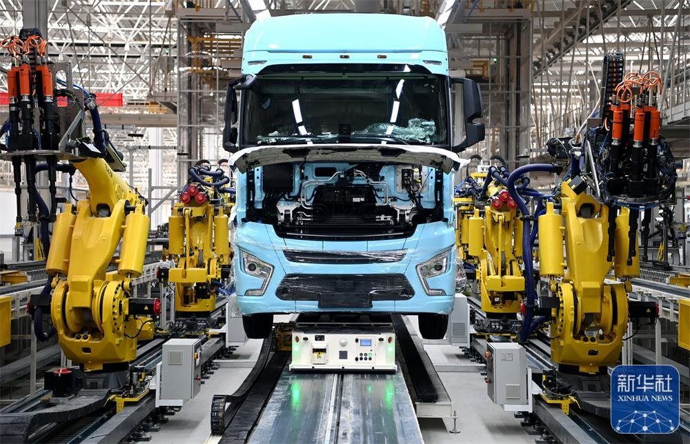 在陜汽重卡擴(kuò)能項(xiàng)目現(xiàn)場(chǎng),一輛重卡在汽車總裝生產(chǎn)線輪胎自動(dòng)化裝配擰緊無(wú)人工作站進(jìn)行裝配(9月27日攝)。新華社記者 劉瀟 攝