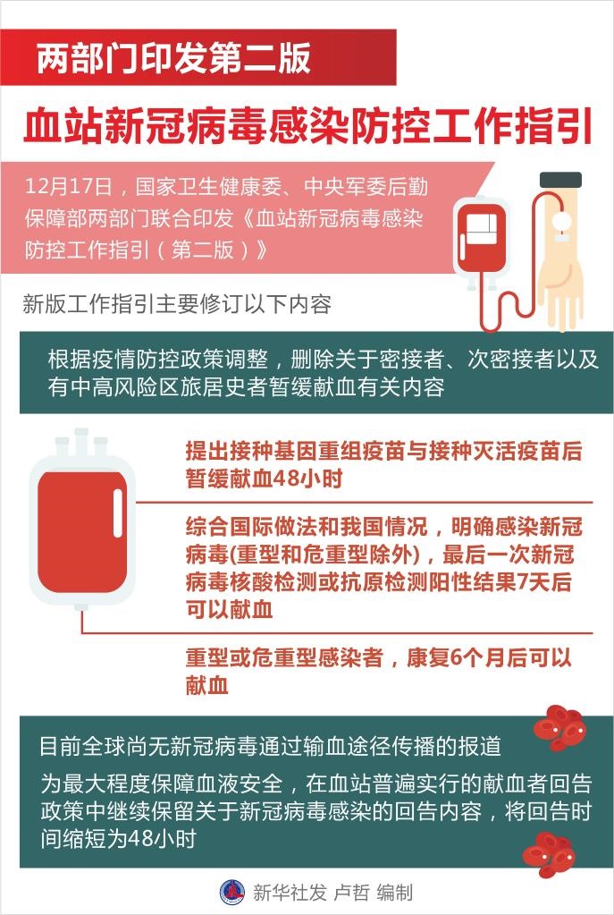 與2021年《血站新冠肺炎疫情常態(tài)化防控工作指引》相比,新版工作指引主要修訂以下內(nèi)容:根據(jù)疫情防控政策調(diào)整,新版工作指引刪除關于密接者、次密接者以及有中高風險區(qū)旅居史者暫緩獻血有關內(nèi)容。提出接種基因重組疫苗與接種滅活疫苗后暫緩獻血48小時。綜合國際做法和我國情況,明確感染新冠病毒(重型和危重型除外),最后一次新冠病毒核酸檢測或抗原檢測陽性結(jié)果7天后可以獻血;重型或危重型感染者,康復6個月后可以獻血。