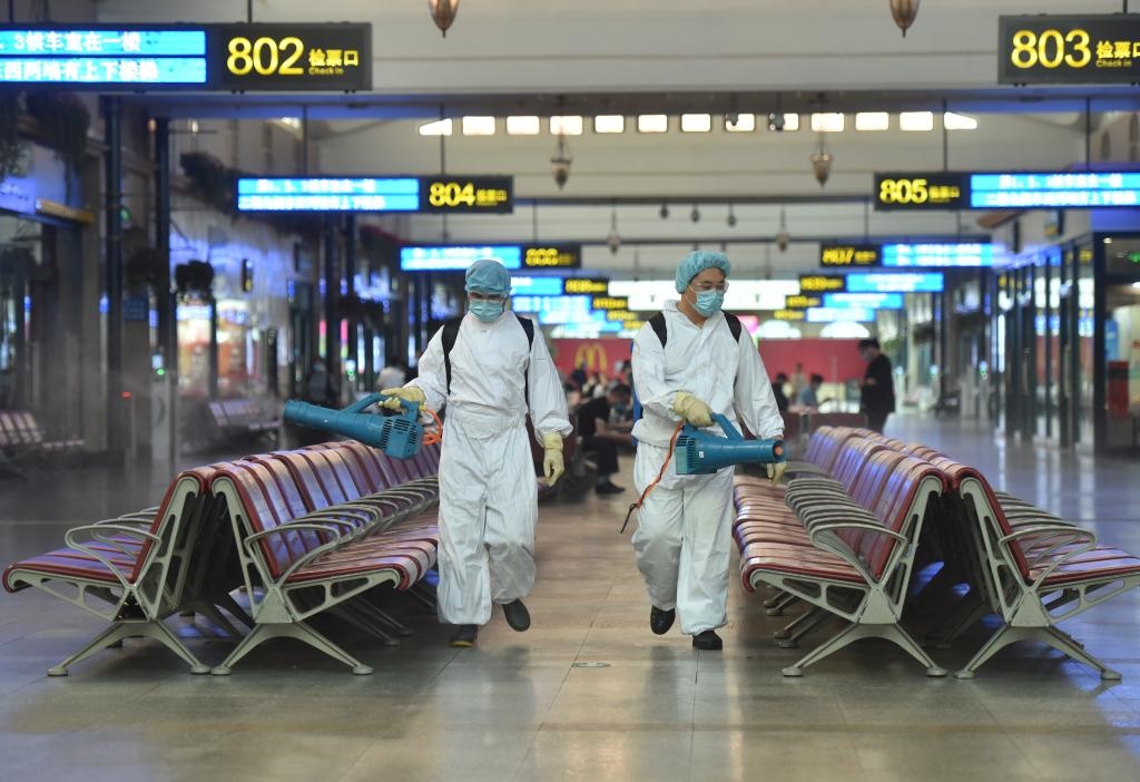 北京站工作人員在候車大廳進行消殺作業(yè)(2020年6月18日攝)。新華社記者 陳鐘昊 攝