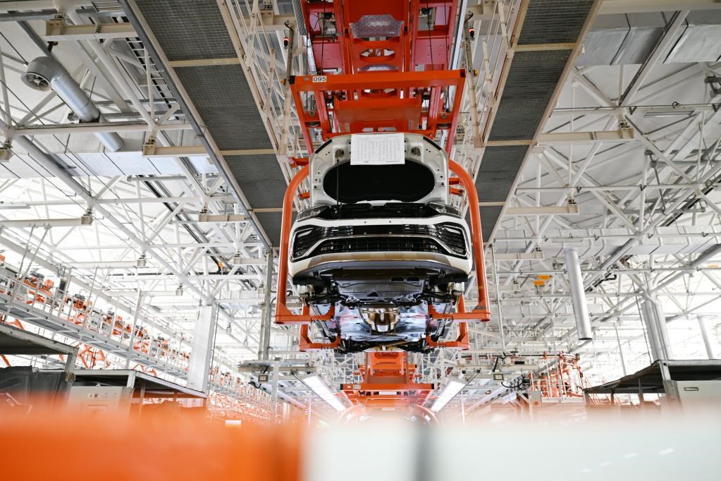 在天津經(jīng)濟技術開發(fā)區(qū)一汽-大眾華北基地,車輛在生產(chǎn)線上等待裝配零部件(2022年6月15日攝)。新華社記者 李然 攝