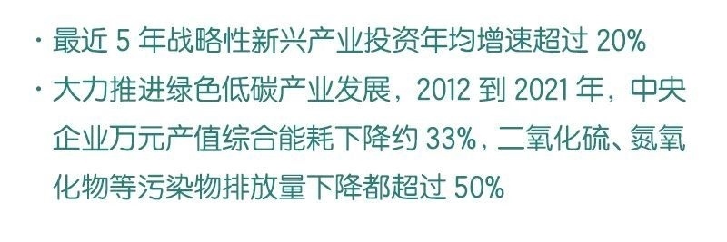 ◆ 截至目前,中央企業(yè)在涉及國家安全和國計民生等領域的營業(yè)收入占比超過70%,最近5年戰(zhàn)略性新興產(chǎn)業(yè)投資年均增速超過20%。