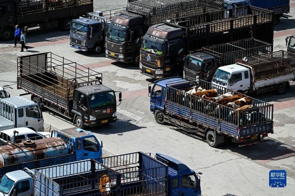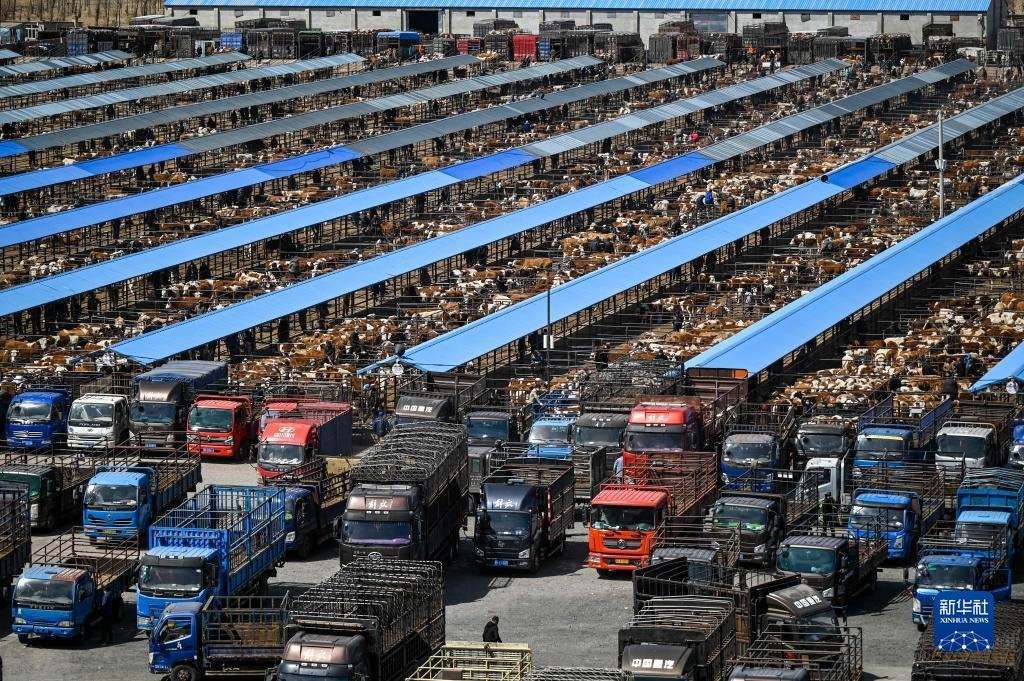 4月12日,內(nèi)蒙古通遼市科爾沁左翼中旗舍伯吐鎮(zhèn)成峰牲畜交易市場里一片繁忙景象,1000余輛貨運車整齊排列,1萬余頭黃牛正等待被交易。據(jù)介紹,這個交易市場年交易80萬頭肉牛,交易額可達(dá)80億元。今年以來,當(dāng)?shù)嘏J行星橹饾u轉(zhuǎn)好,來自遼寧、吉林、山東等地的買家再次聚集于此,帶動了養(yǎng)殖戶增收。新華社記者 連振 攝